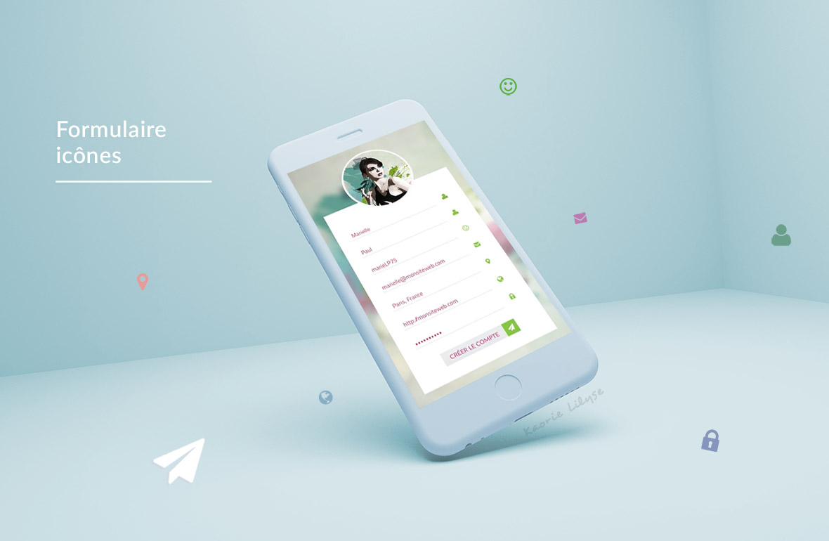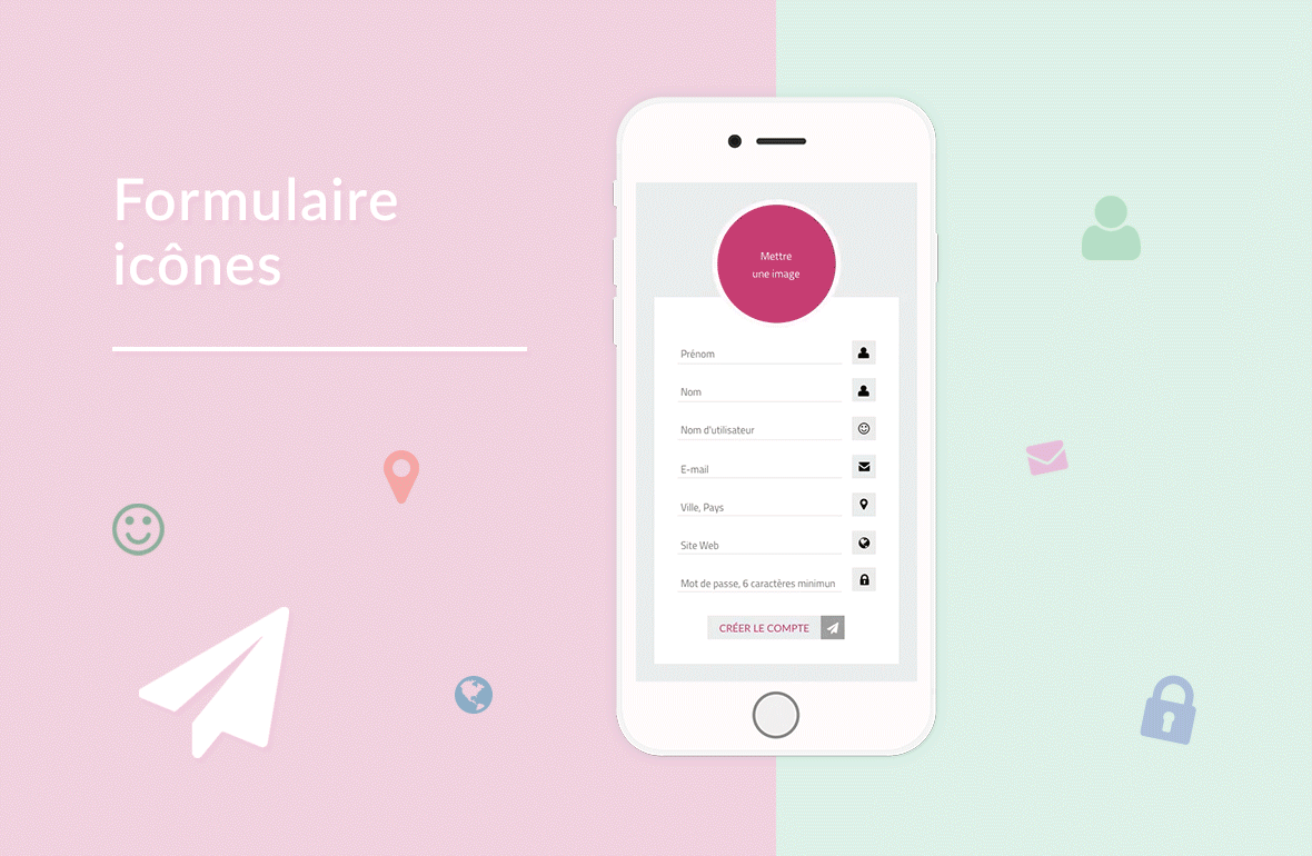 Formulaire icônes est un formulaire de création de comptes (qui peut également servir de formulaire de connexion) au design simple, où tous ses éléments sont animés.