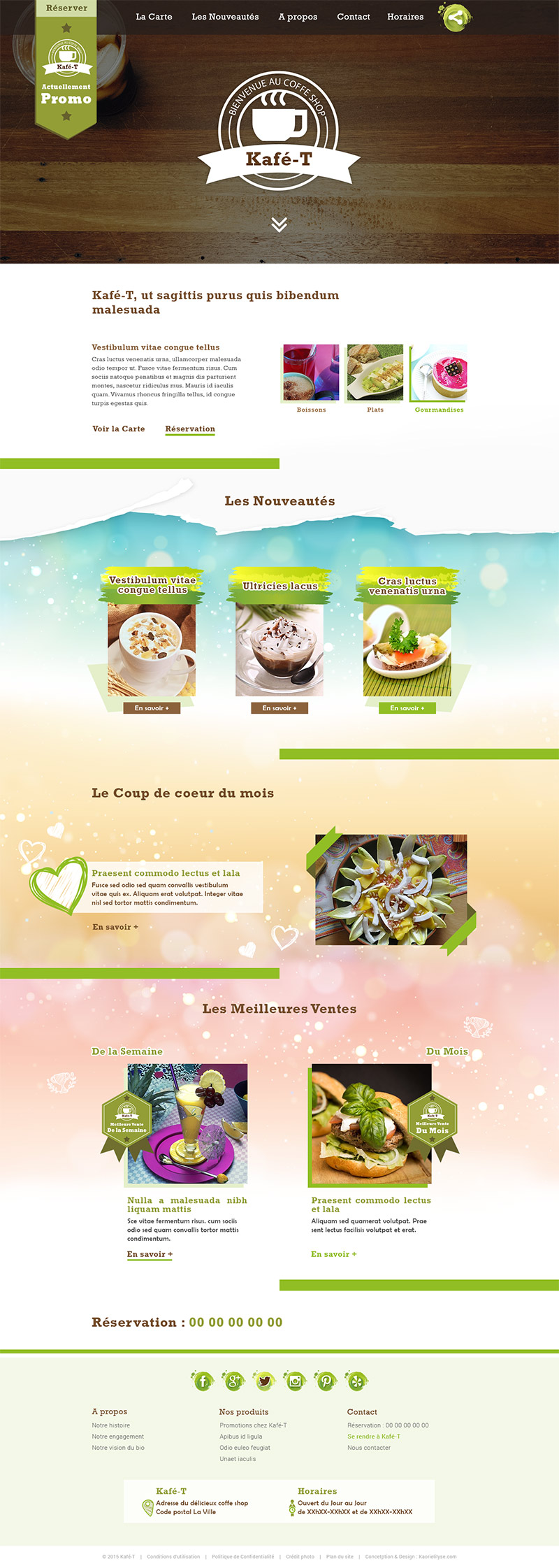 Le ton du site web est festif et frais (sûrement pour rappeler que manger leurs délicieux produits bio et frais est une fête). Et qui dit bio, dit vert. Donc ne soyez pas surpris si le vert est très présent dans la charte graphique de Kafé-T.